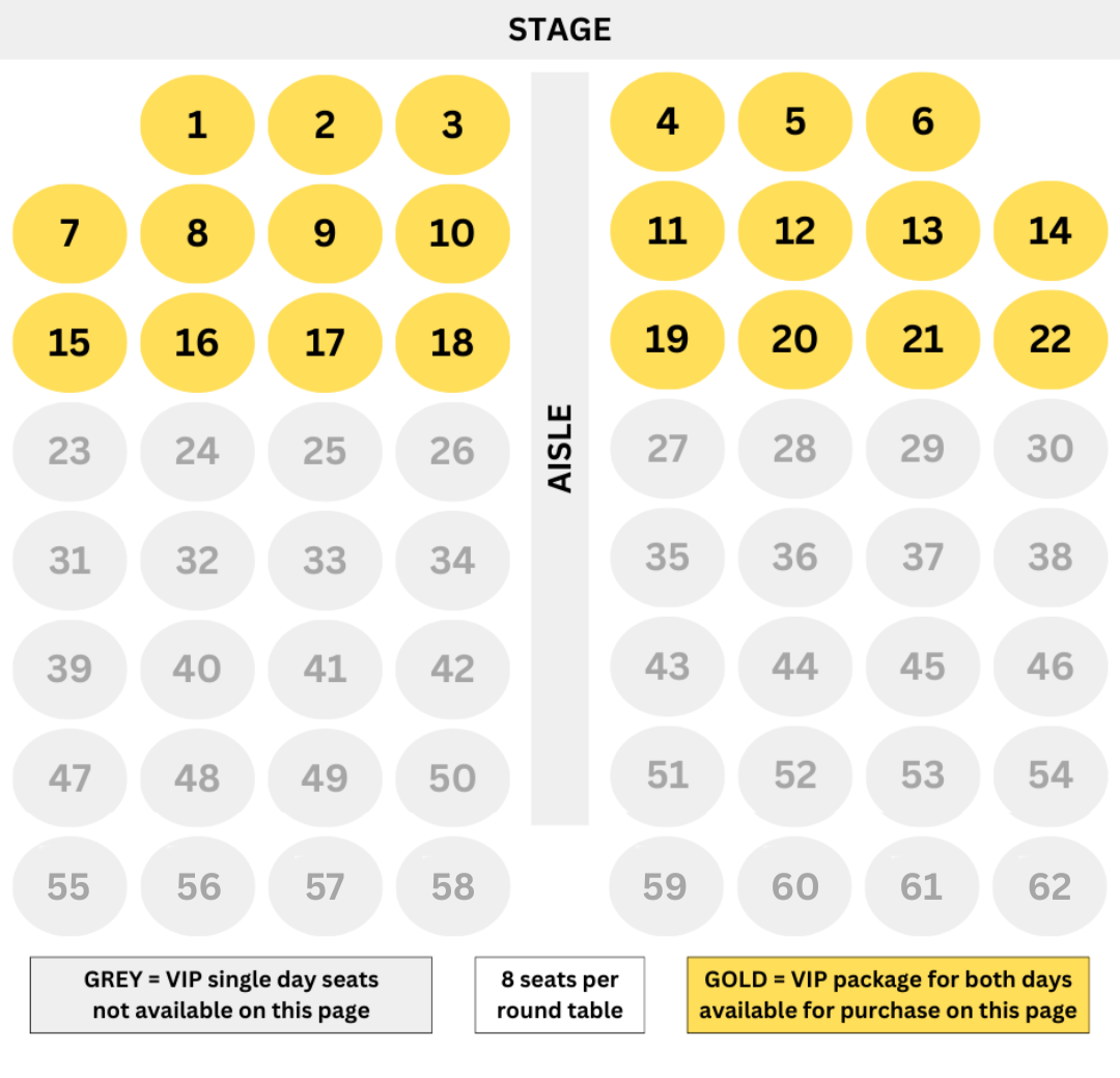 Gold Package VIP Seats are available at the tables in the first three rows, closest to the stage. Single-day VIP seats are located in the back five rows.